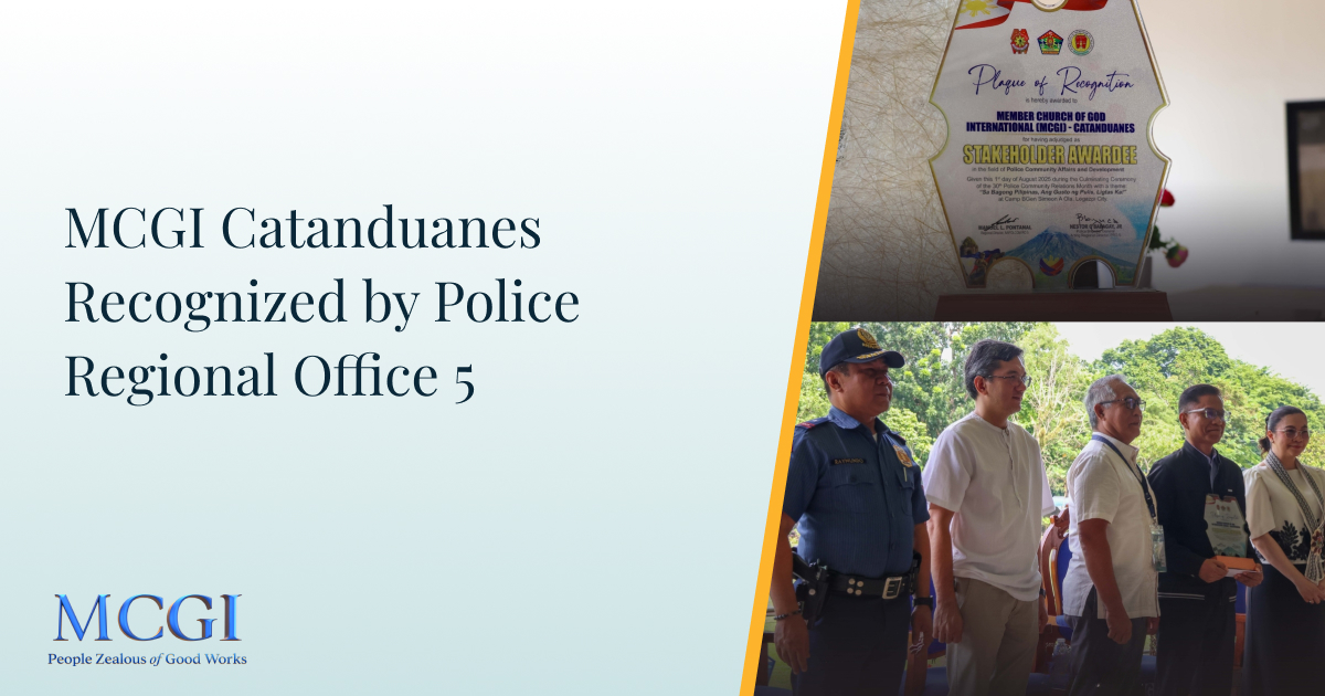 The Members Church of God International (MCGI)-Catanduanes was recognized by the Police Regional Office 5 with the Stakeholder Award on August 1, 2025. This honor highlights MCGI’s exemplary community outreach, which includes donating solar street lights and providing free medical and legal services.